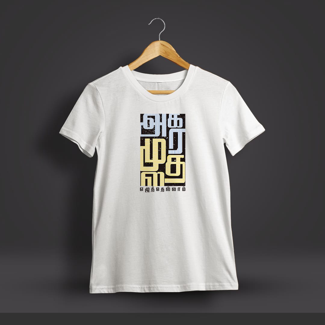 Agara Mudhala Ezhuthellam Thirukkural Printed T-Shirt celebrates Tamil heritage with the first verse of Thirukkural. A must-have for lovers of Tamil literature.