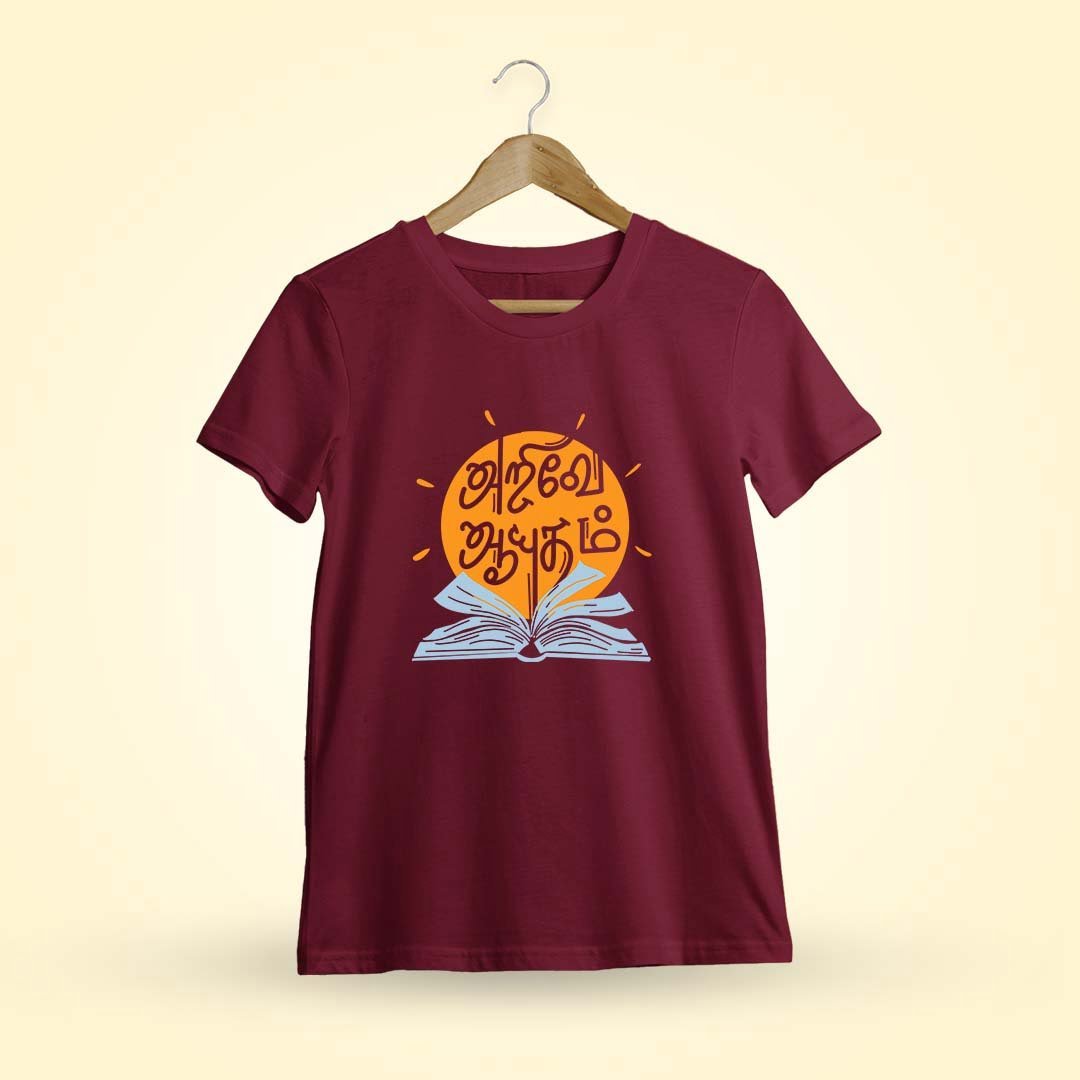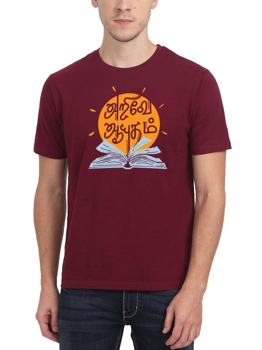 Elevate knowledge with ‘Arivae Ayudham – Arivu’ T-shirt as Men Half Sleeve. Embrace wisdom. Shop now!