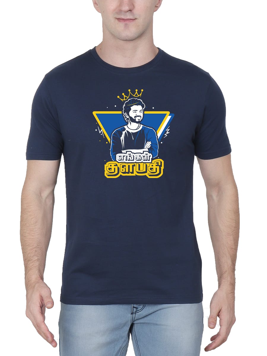 Flaunt your Thalapathy pride with the Engal Thalapathy Vijay T-shirt. A tribute to the superstar, this tee merges fandom and fashion in one perfect design.