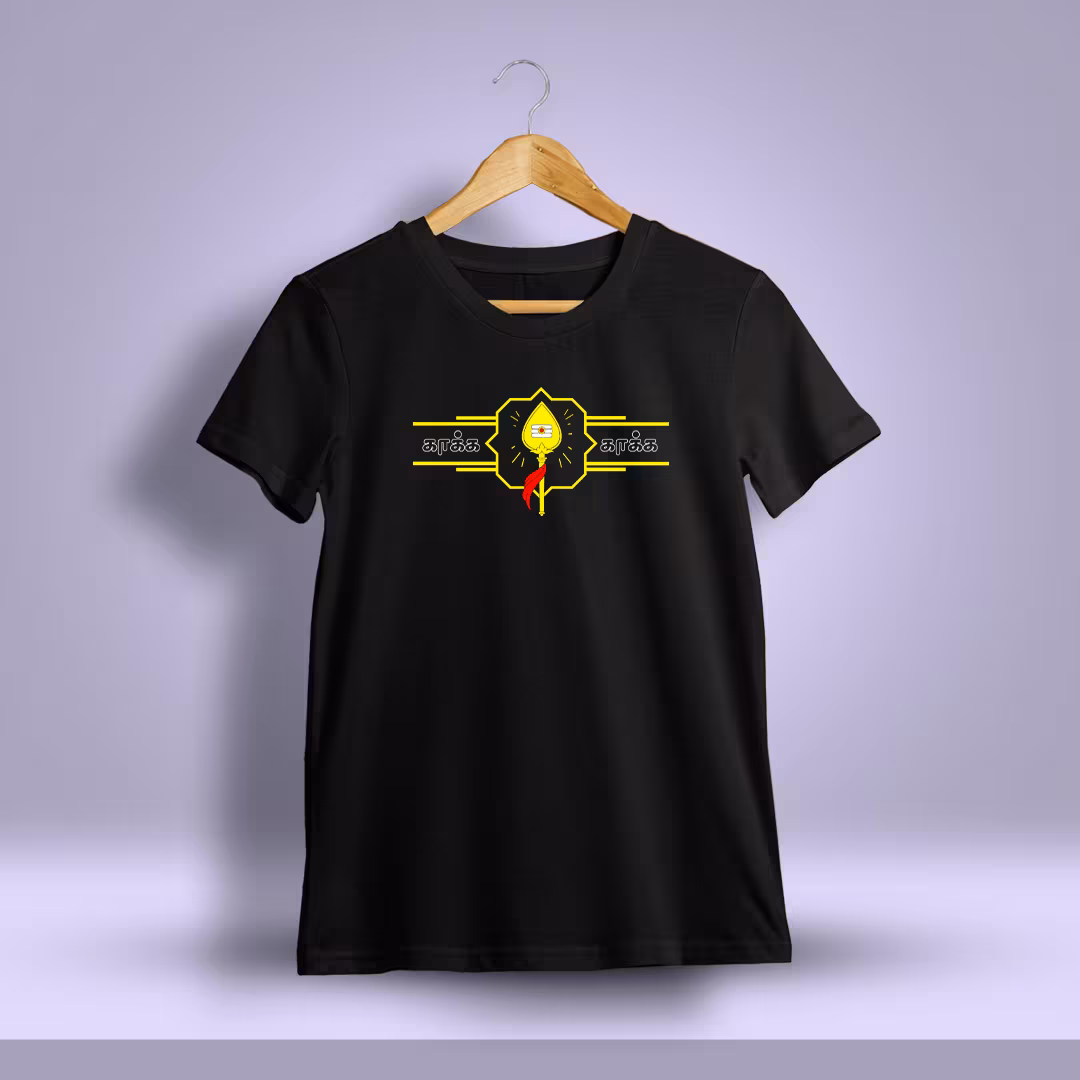 Kaaka Kaaka Vel God Murugan T-Shirt features a bold representation of Lord Murugan’s Vel, symbolizing victory over obstacles and a fearless approach to life.