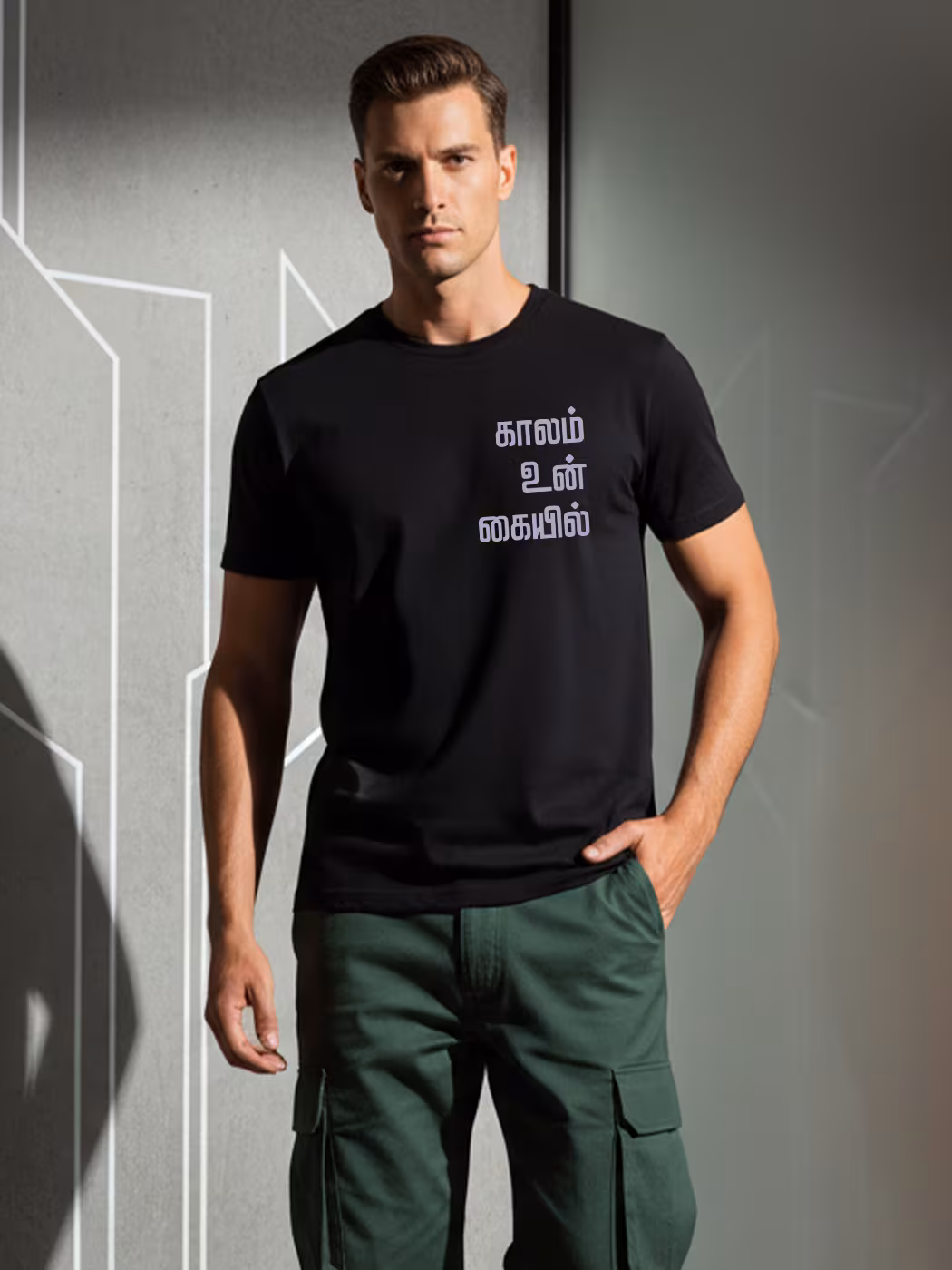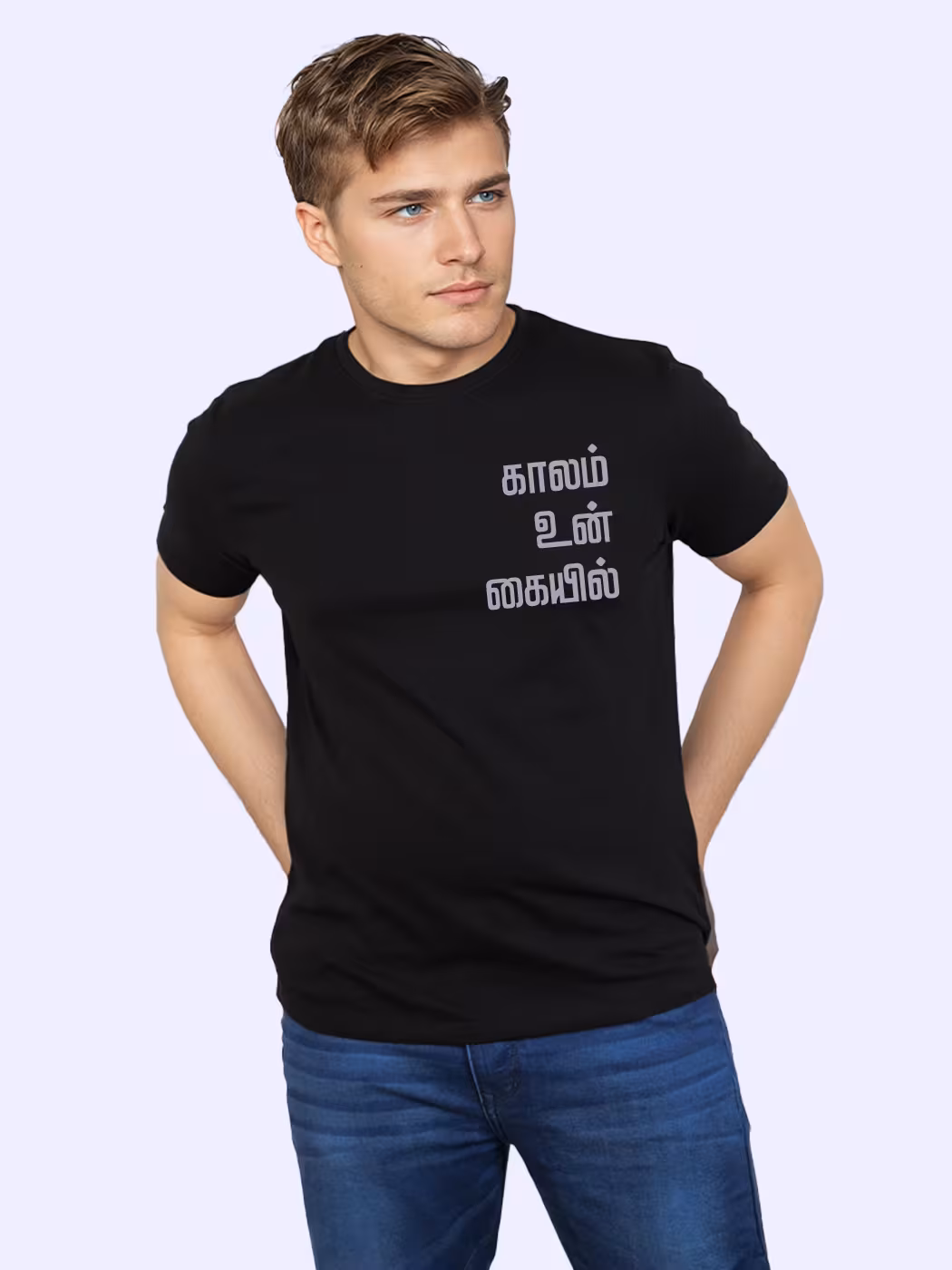 Empower your journey with the Kaalam Un Kaiyil T-shirt. Soft fabric, stylish Tamil typography, and motivational design that inspires strength and self-belief.