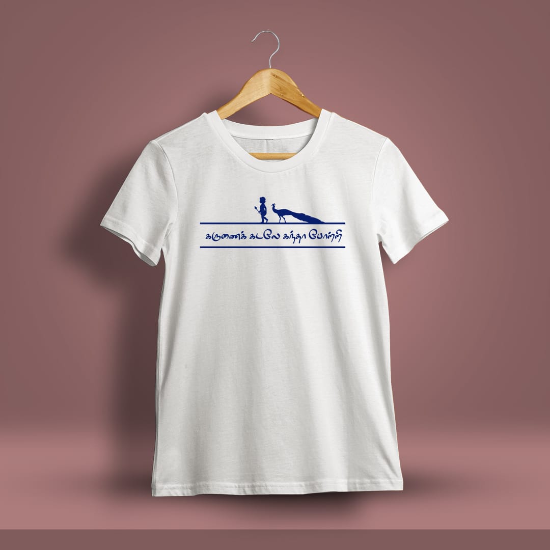 Celebrate divine grace with our Karunai Kadale Kandha Potri tee. Soft cotton, bold print, perfect for spiritual men embracing tradition and modern comfort together.