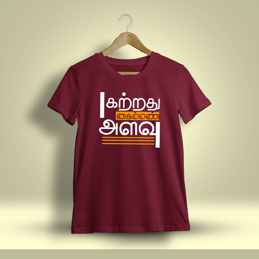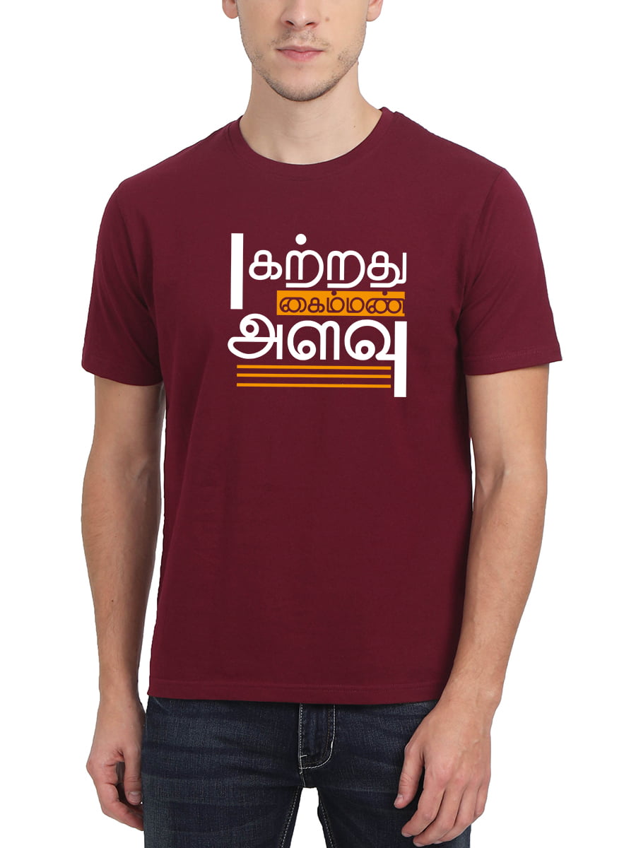 Katrathu Kaiman Alavu Tamil T-Shirt for men with half sleeves offers comfort and style, featuring a thoughtful Tamil quote that highlights the limitless pursuit of knowledge.