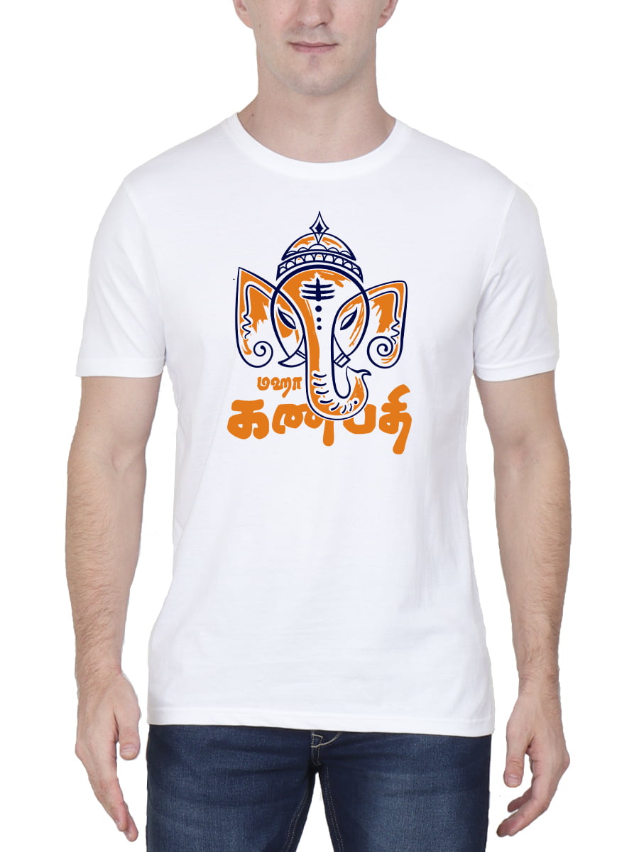Maha Ganapathi Vinayagar T-Shirt for men, half sleeve, made from soft fabric. Showcases a bold Vinayagar design, blending comfort and style for a spiritual, casual look.