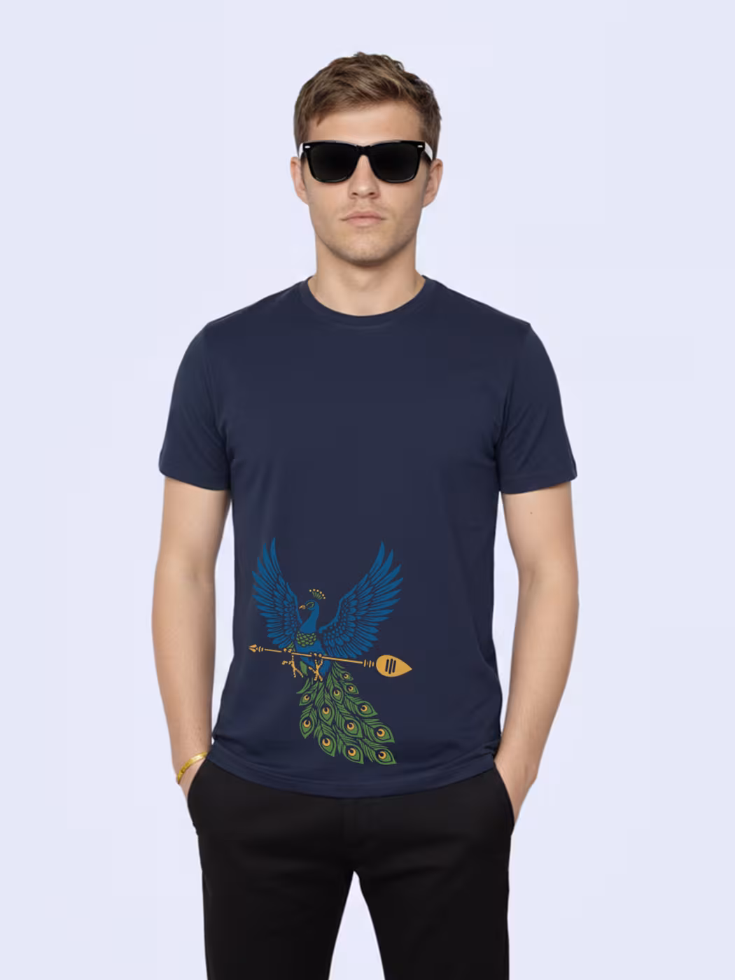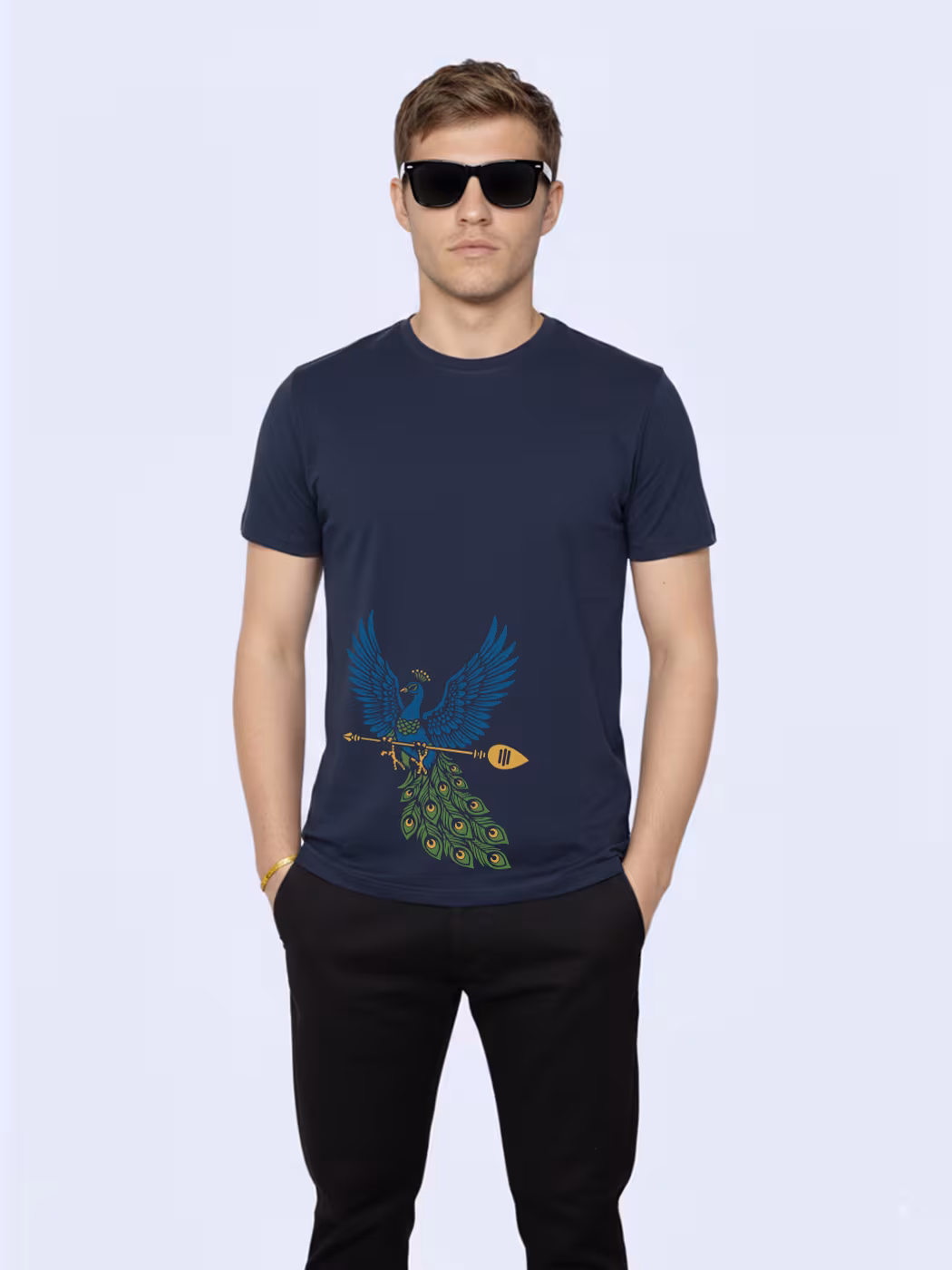 Graceful Mayil design on a half-sleeve tee brings Tamil elegance and culture alive, perfect for men celebrating beauty, heritage, and comfort with modern minimal flair.