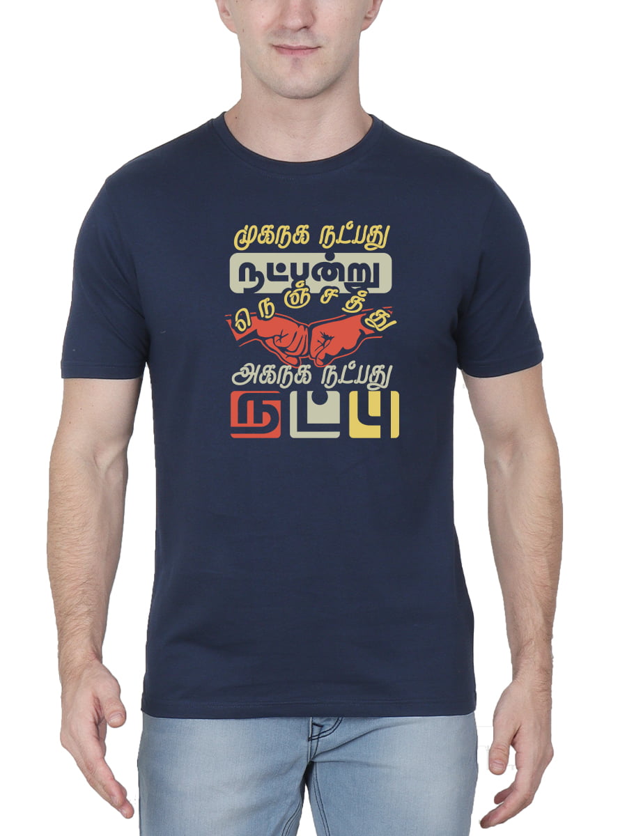 Muganaga Natpathu Natpandru Thirukkural T-Shirt for men with half sleeves features a profound Thirukkural verse, blending comfort and wisdom for those who value cultural and philosophical insights.