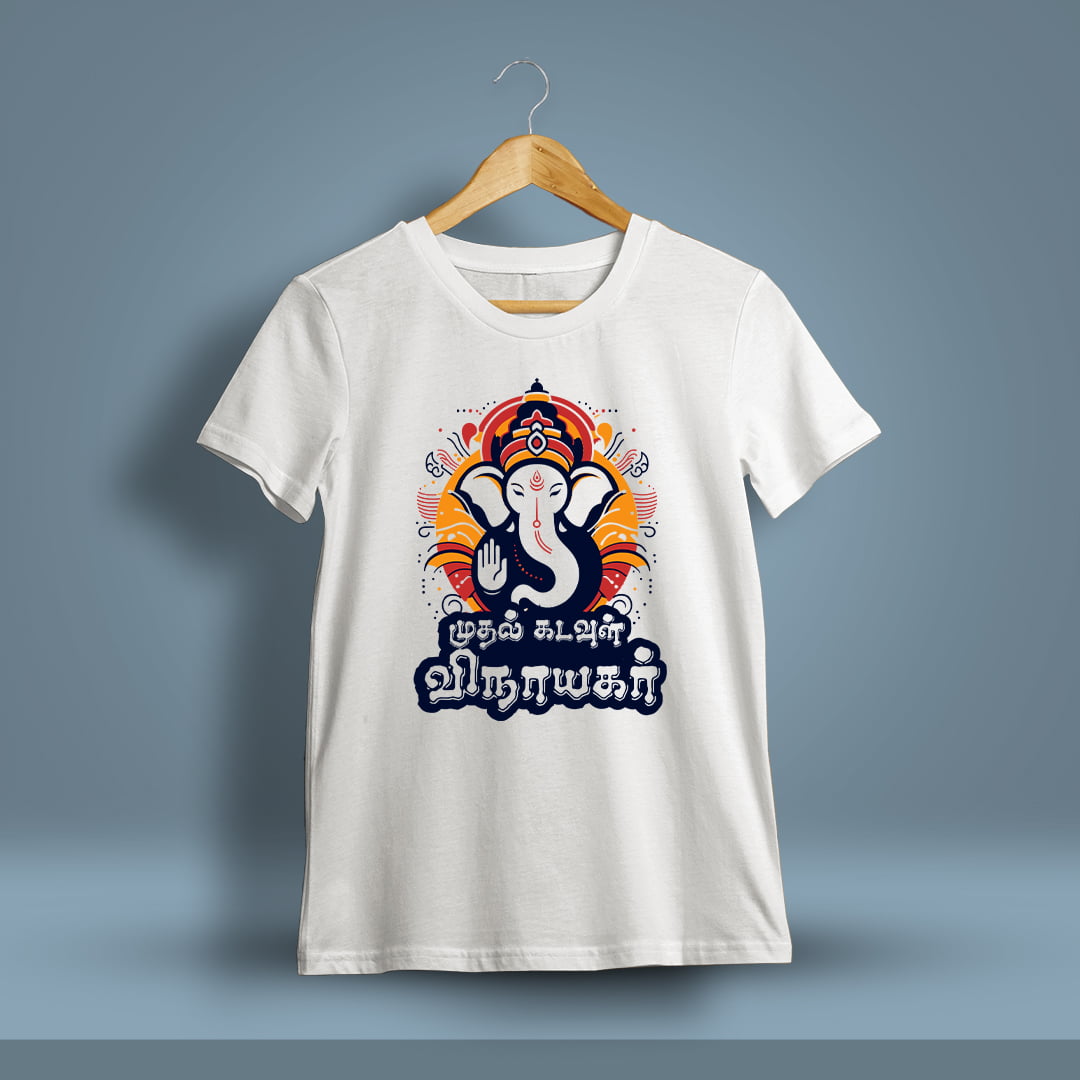 Muthal Kadavul Vinayagar T-Shirt for men, half sleeve, made from soft, comfortable fabric. Showcases a striking Vinayagar design, perfect for a spiritual and stylish look.