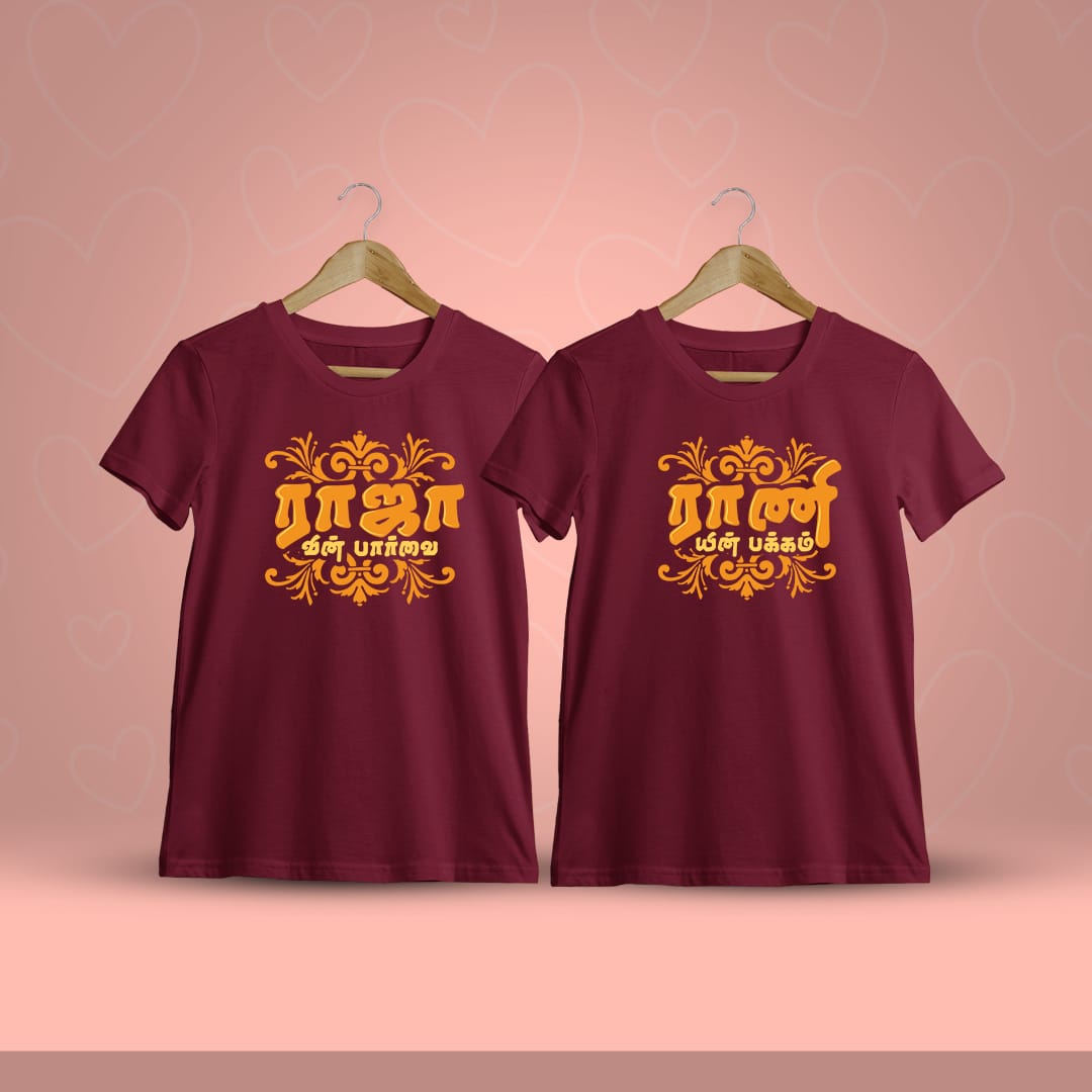 Rajavin Parvai Raniyin Pakkam Tamil Couple T-Shirt celebrates iconic love with a stylish design. Made for comfort, perfect for couples to express unity and romance.