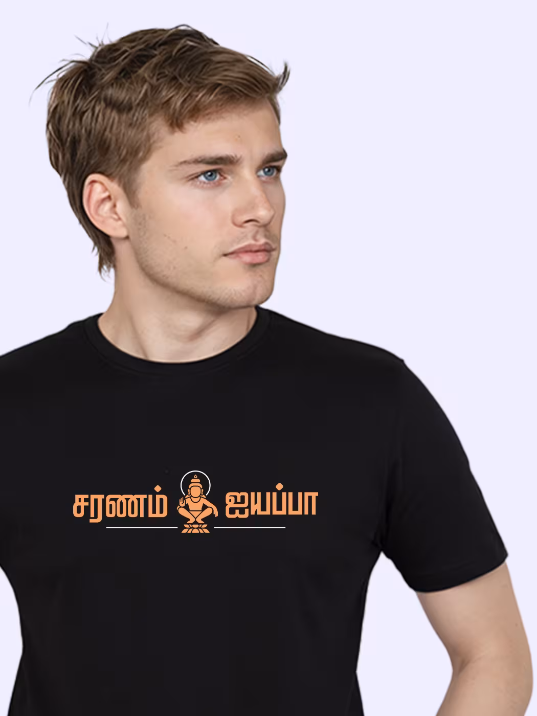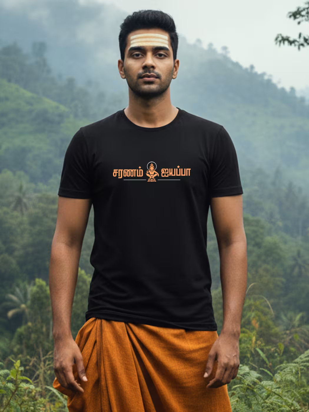 Saranam Ayyappa God Ayyappan T-Shirt showcases a powerful design with the devotional chant “Saranam Ayyappa.” Comfortable and stylish, perfect for expressing your faith.