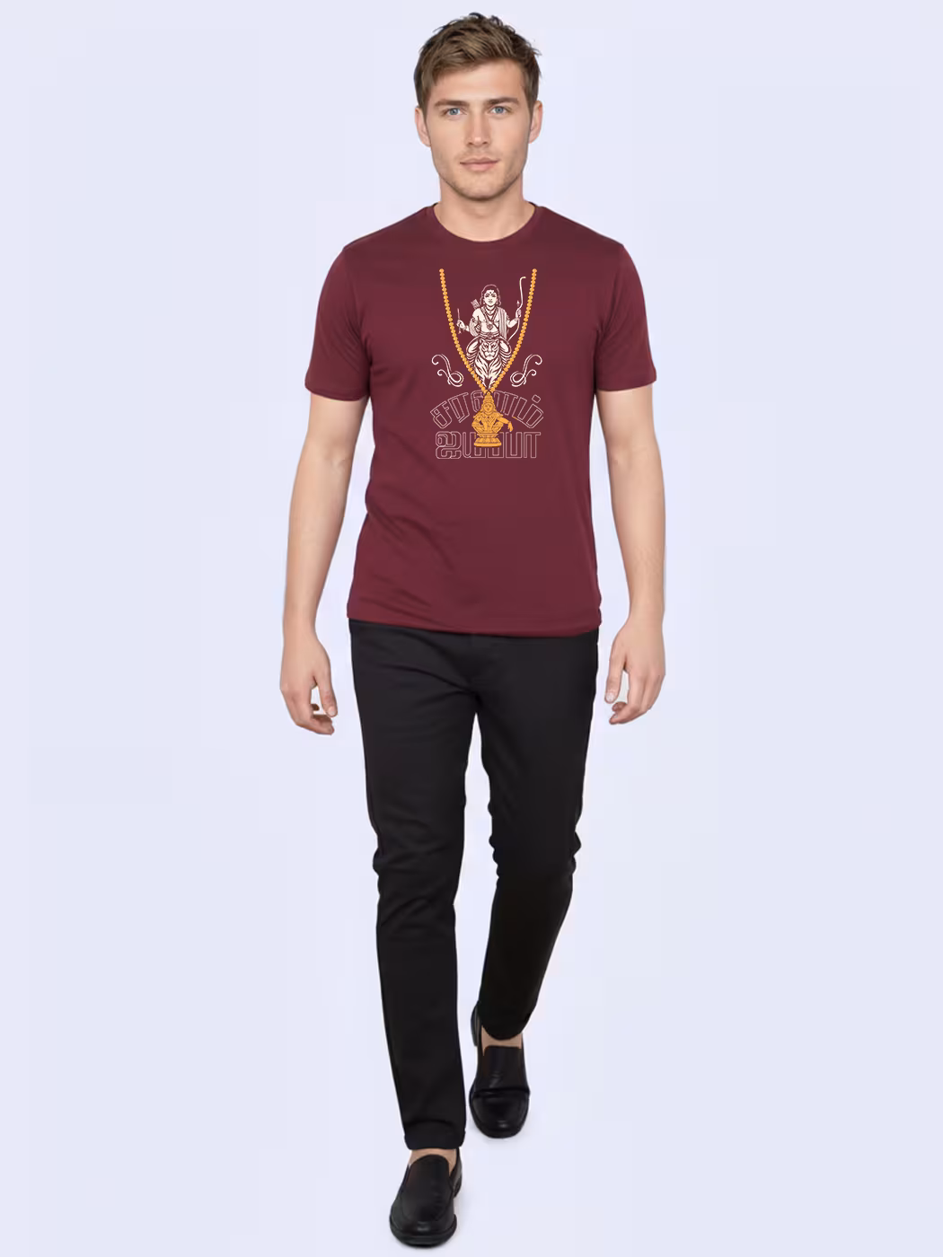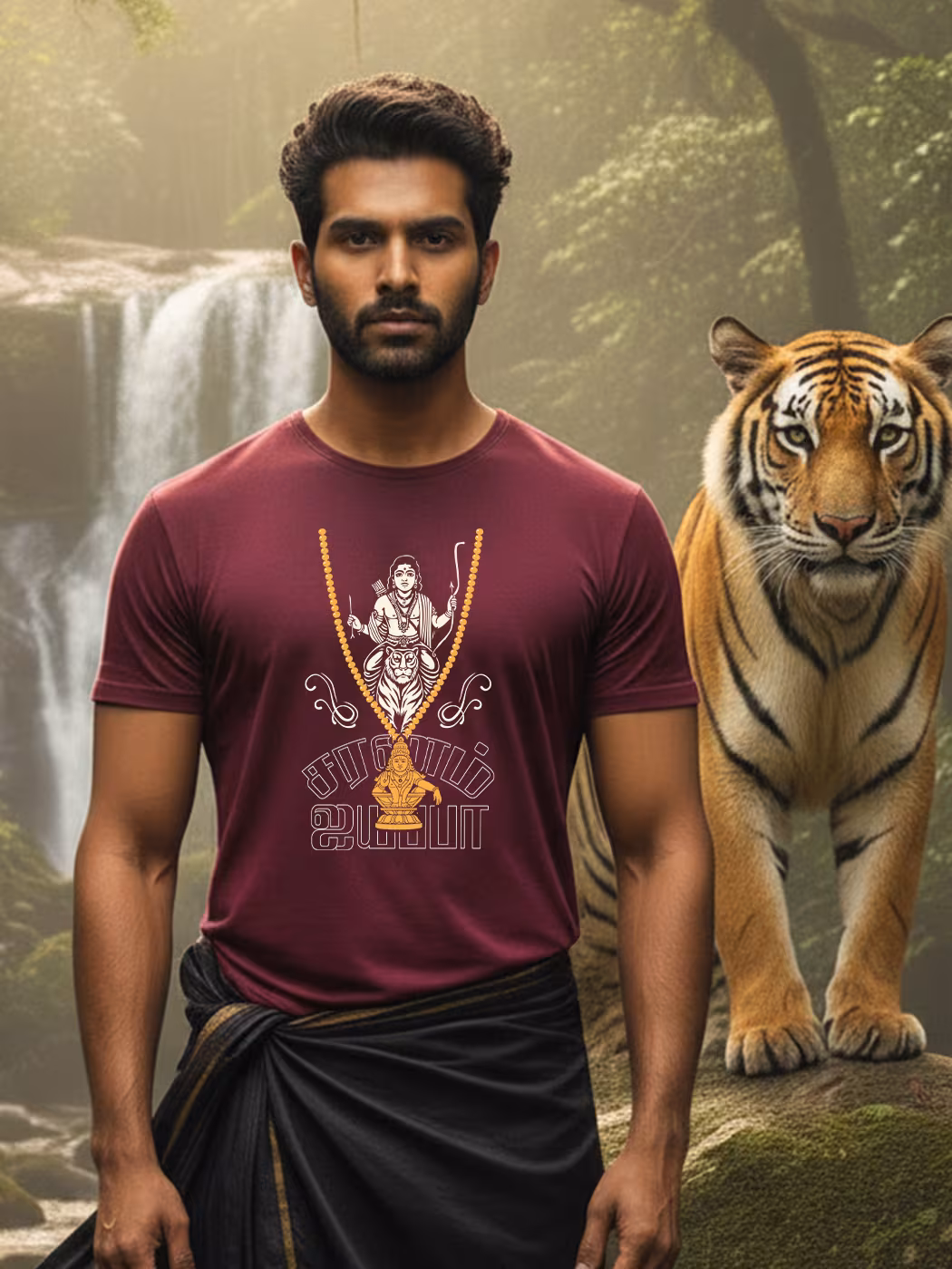 Saranam Ayyappa God Ayyappan T-Shirt showcases a powerful design with the devotional chant “Saranam Ayyappa.” Comfortable and stylish, perfect for expressing your faith.