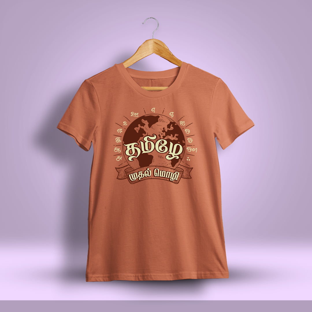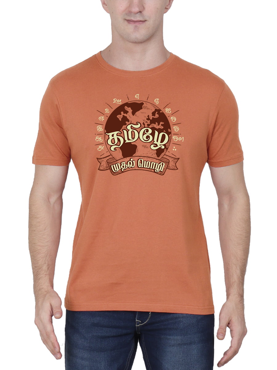 Tamizhe Muthal Mozhi Tamil T-Shirt for Men features a half-sleeve design with proud Tamil text, offering comfort and style while celebrating the Tamil language.