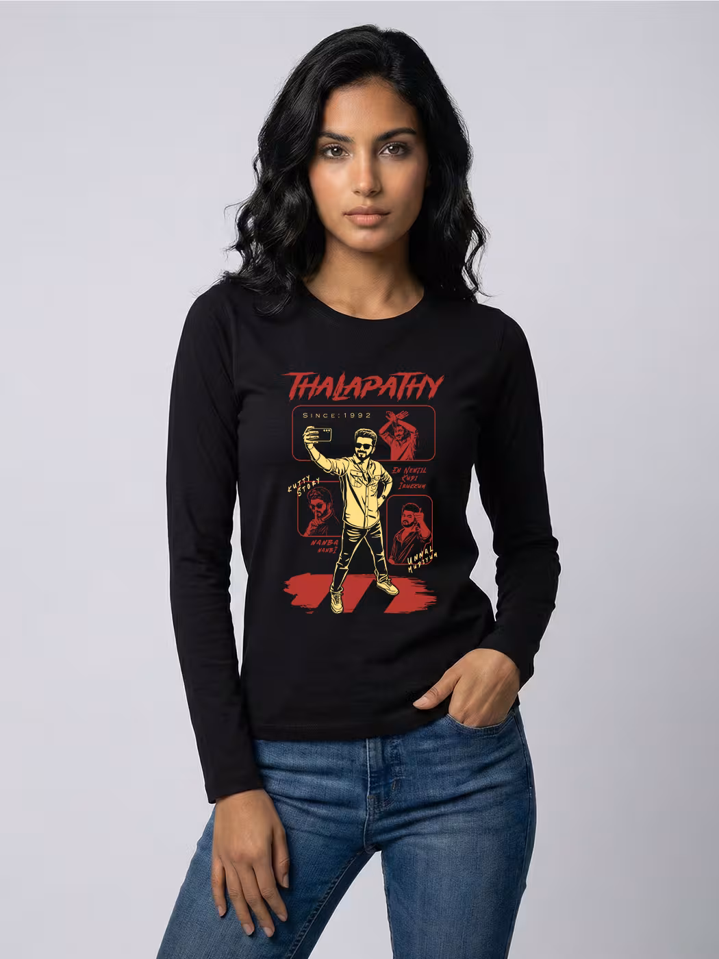 Stylish full sleeve T-shirt inspired by Thalapathy Vijay vibes. Made with soft, breathable fabric for all-day comfort and a bold casual look.