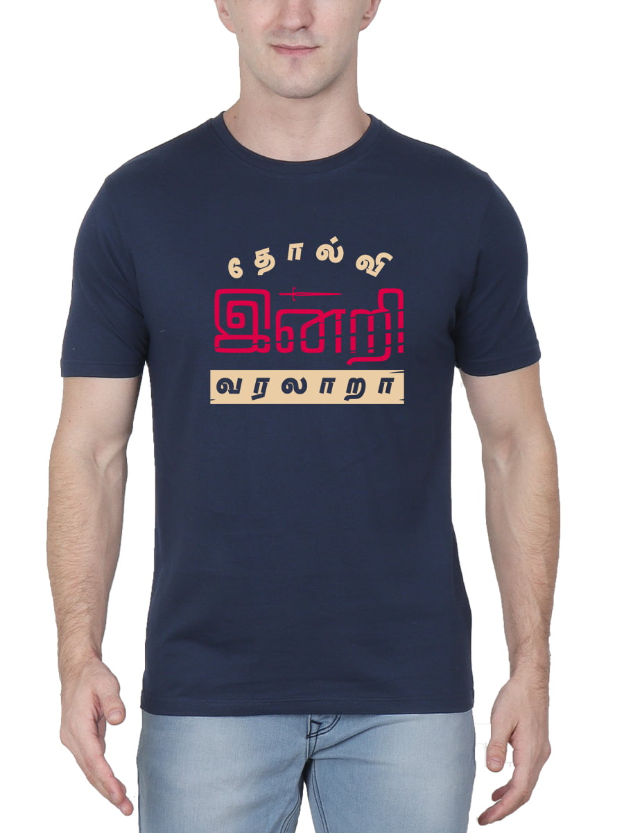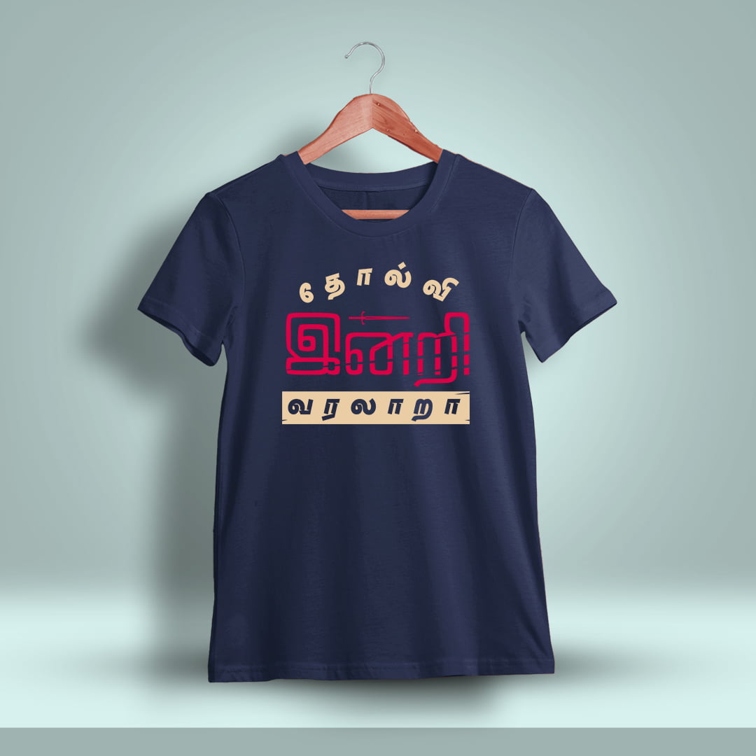 Tholvi Indri Varalara Tamil T-Shirt for Men has a half-sleeve design featuring a motivational Tamil quote, blending comfort with a message of perseverance and progress.