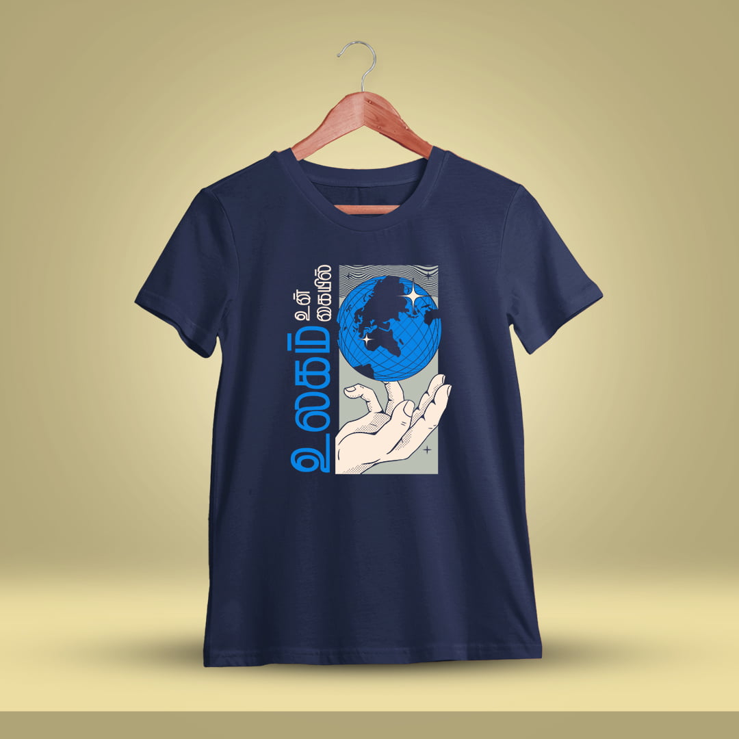 Ulagam Un Kaiyil Tamil T-Shirt signifies “The World is in Your Hands” in elegant script. Ideal for those who believe in empowerment and cherish Tamil culture.