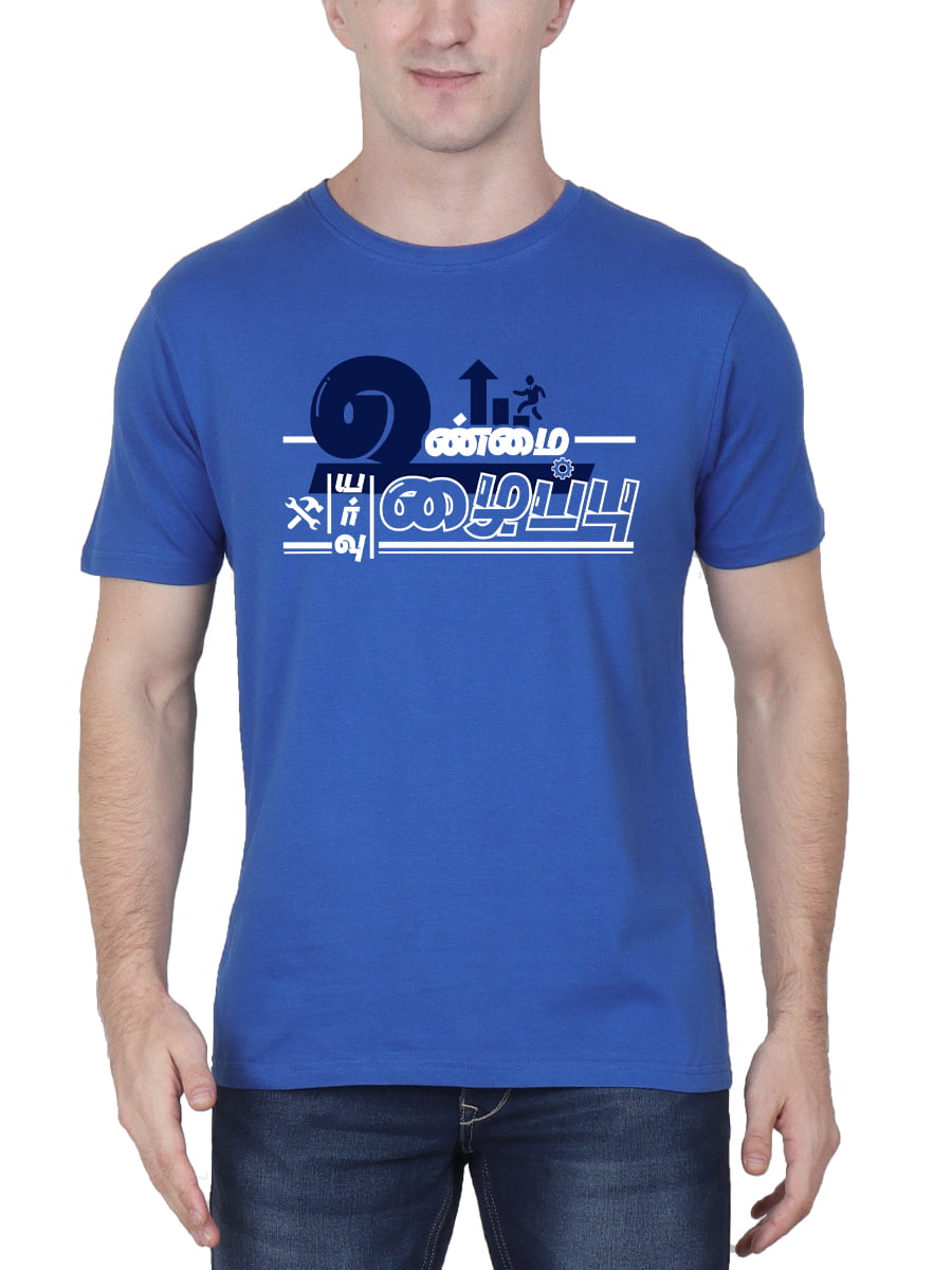 Unmai Uzhaippu Uyarvu Tamil T-Shirt for Men features a half-sleeve design with a powerful Tamil quote, offering both comfort and a reminder of the value of hard work.
