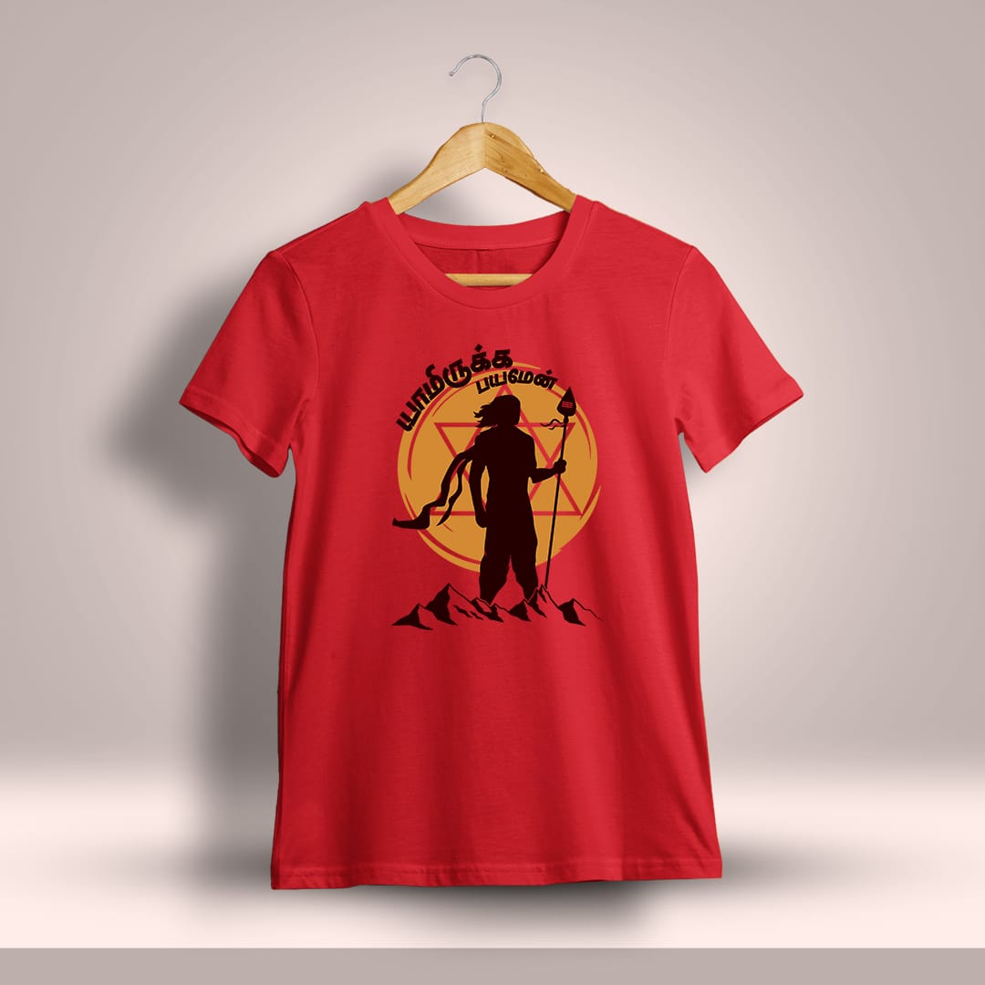 Yamirukka Bayamen God Murugan T-Shirt showcases unwavering faith in Lord Murugan, inspiring courage and spiritual strength in every step with its bold design.